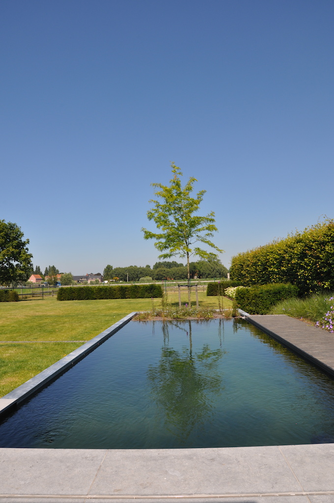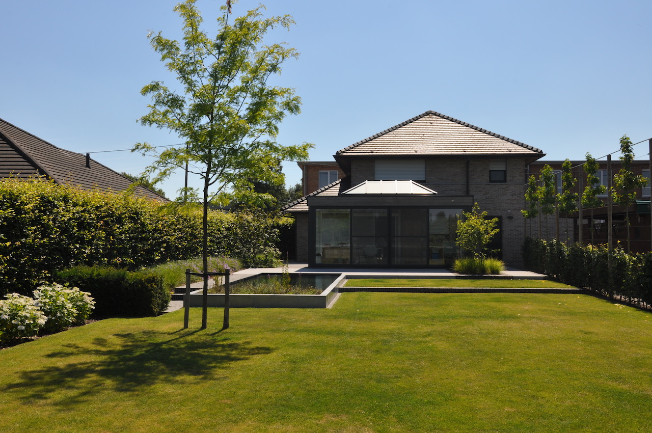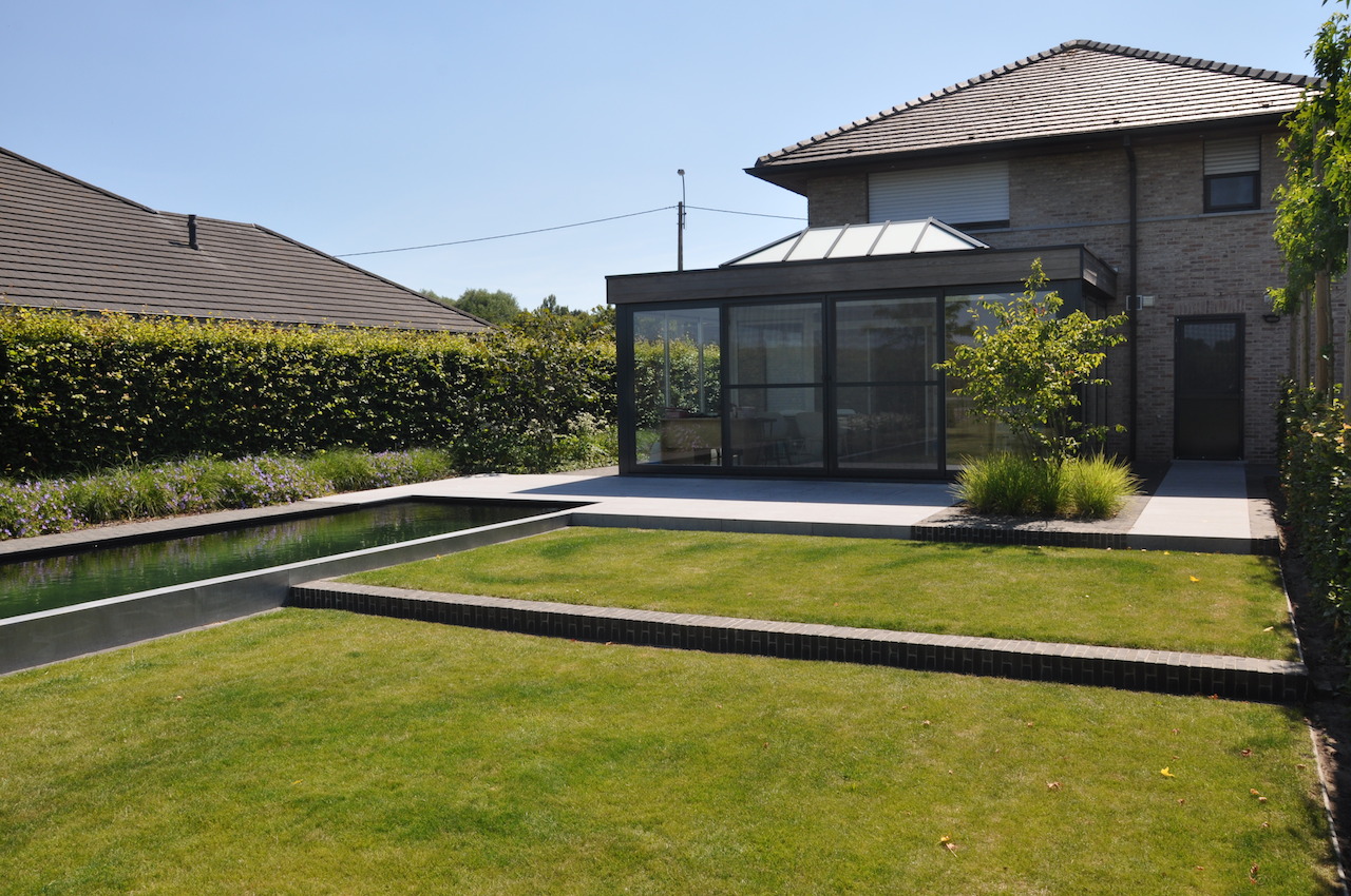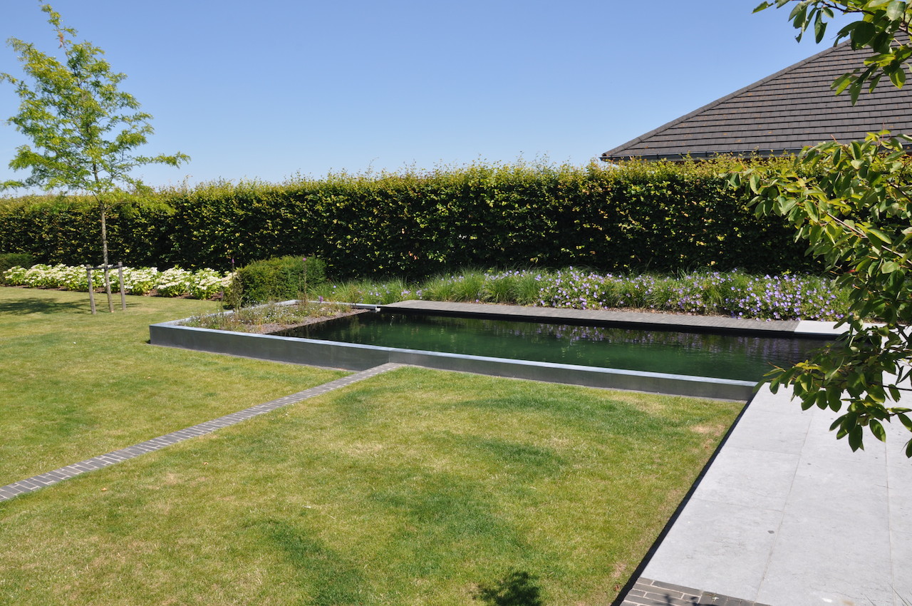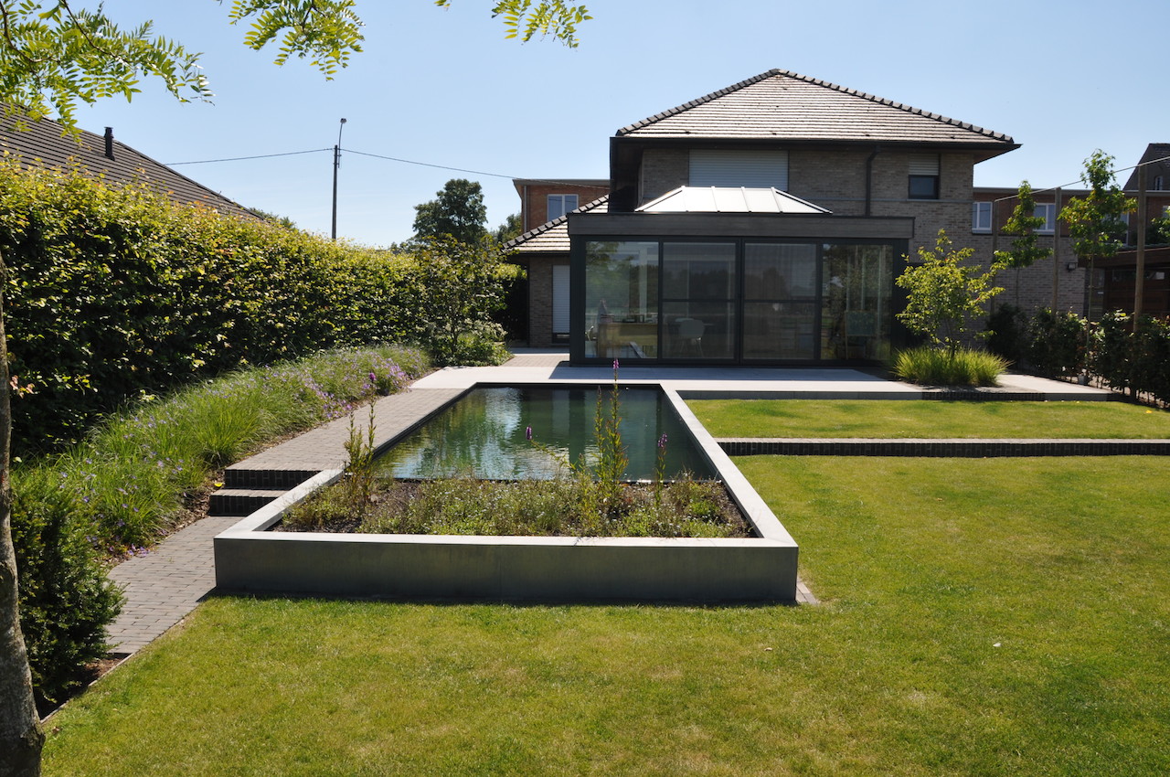 Deze strakke tuin met een sterk lijnenspel geeft uit op een prachtig landschappelijk zicht. De tuin wordt uitermate geïntegreerd met het landschap, waardoor de buitenruimte enorm ruimtelijk is. Deze onderhoudsvriendelijke en kindvriendelijke tuin biedt ruimte en sfeer waar gemakkelijk een balletje getrapt kan worden en waar geravot en geplonsd kan worden in de verfrissende zwemvijver...