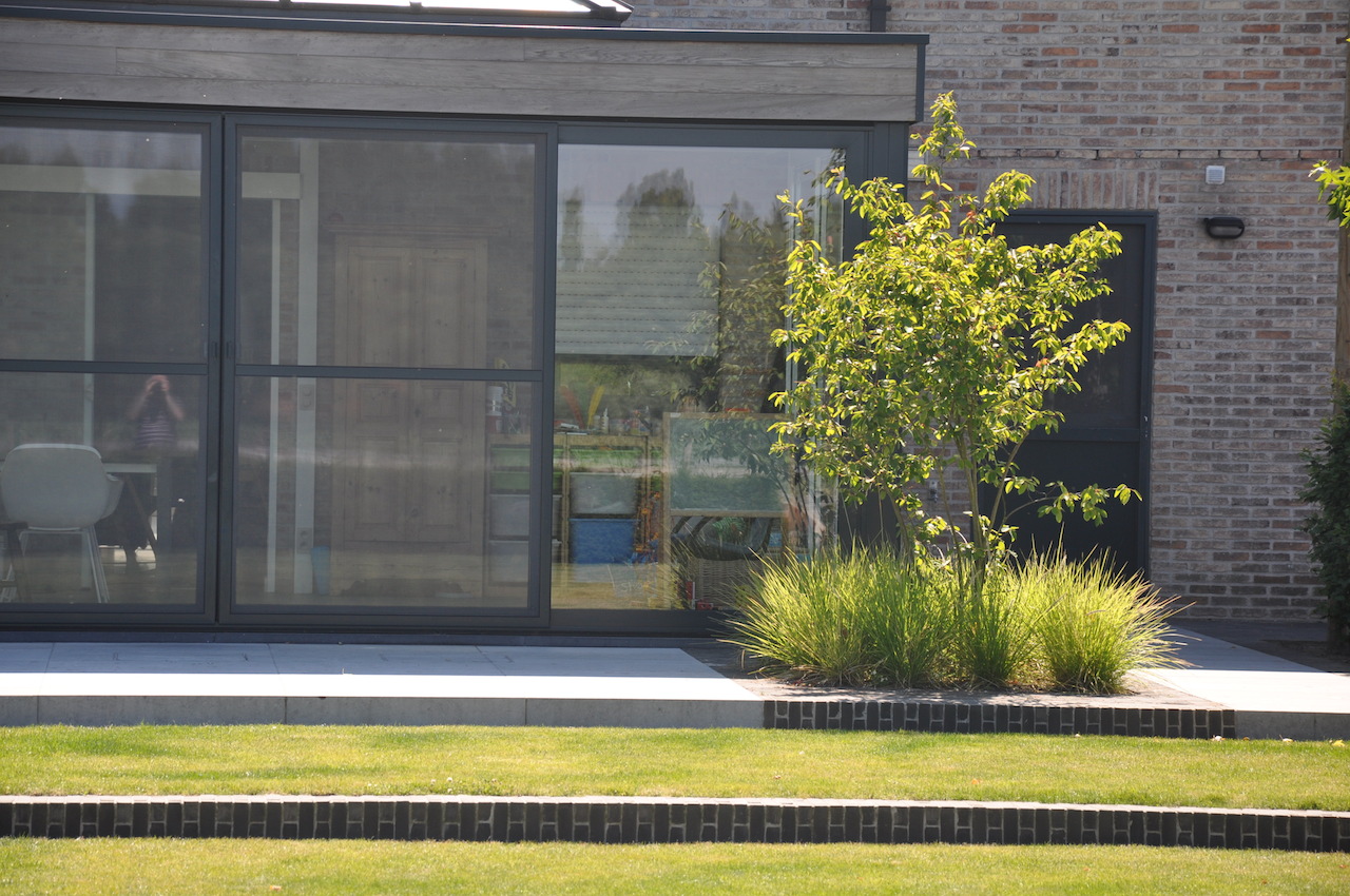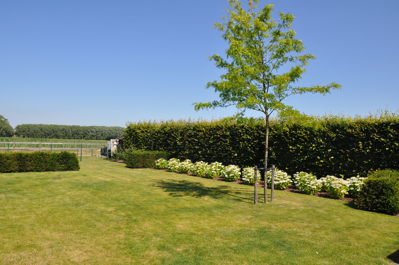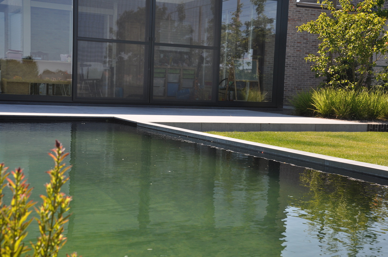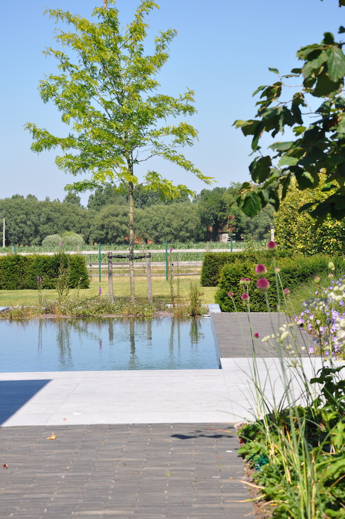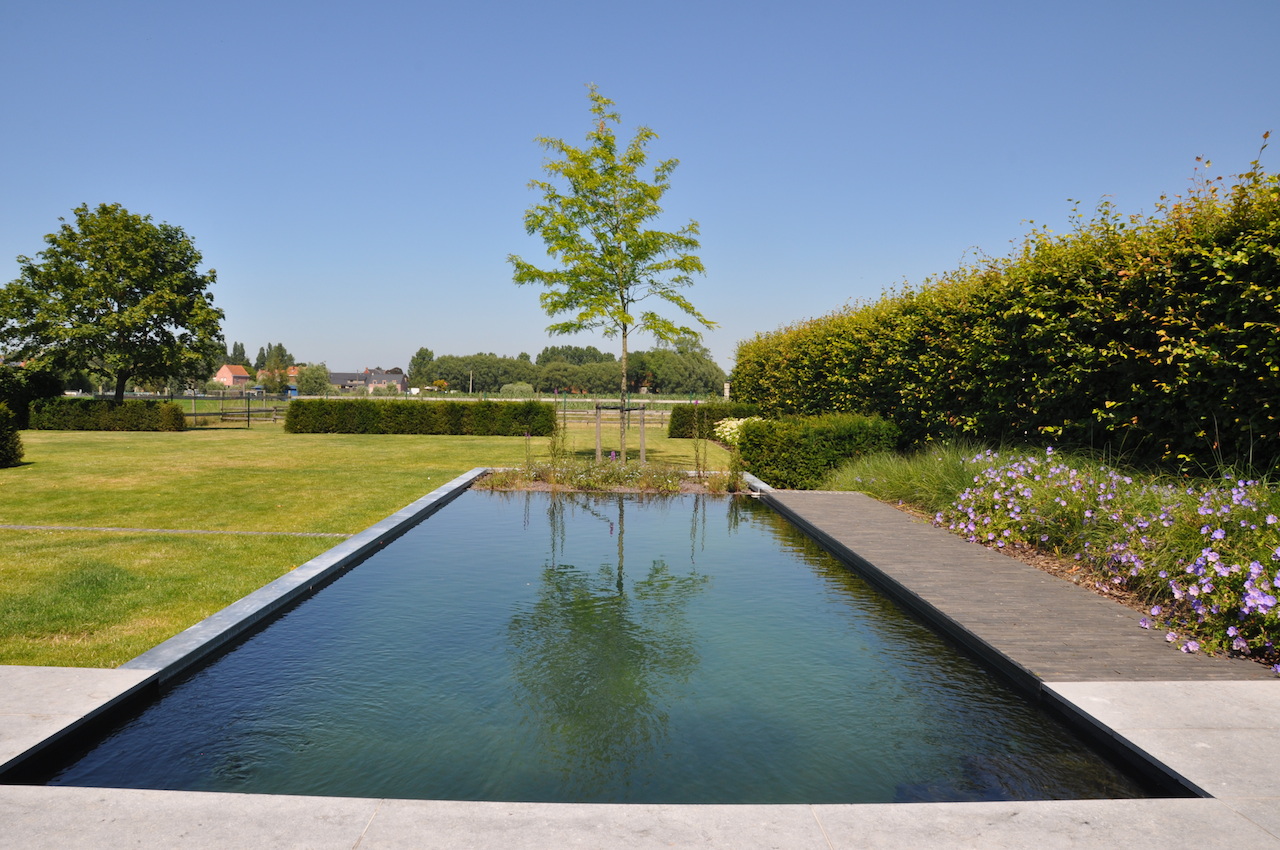 Deze strakke tuin met een sterk lijnenspel geeft uit op een prachtig landschappelijk zicht. De tuin wordt uitermate geïntegreerd met het landschap, waardoor de buitenruimte enorm ruimtelijk is. Deze onderhoudsvriendelijke en kindvriendelijke tuin biedt ruimte en sfeer waar gemakkelijk een balletje getrapt kan worden en waar geravot en geplonsd kan worden in de verfrissende zwemvijver...
