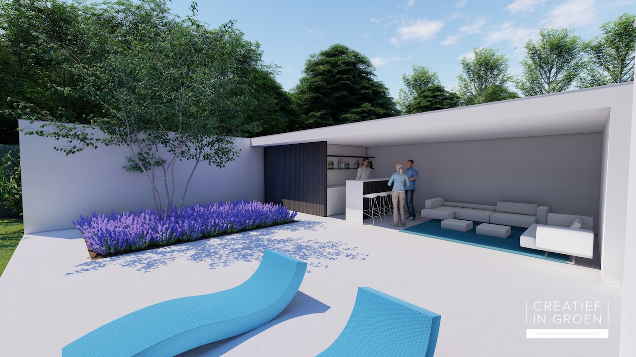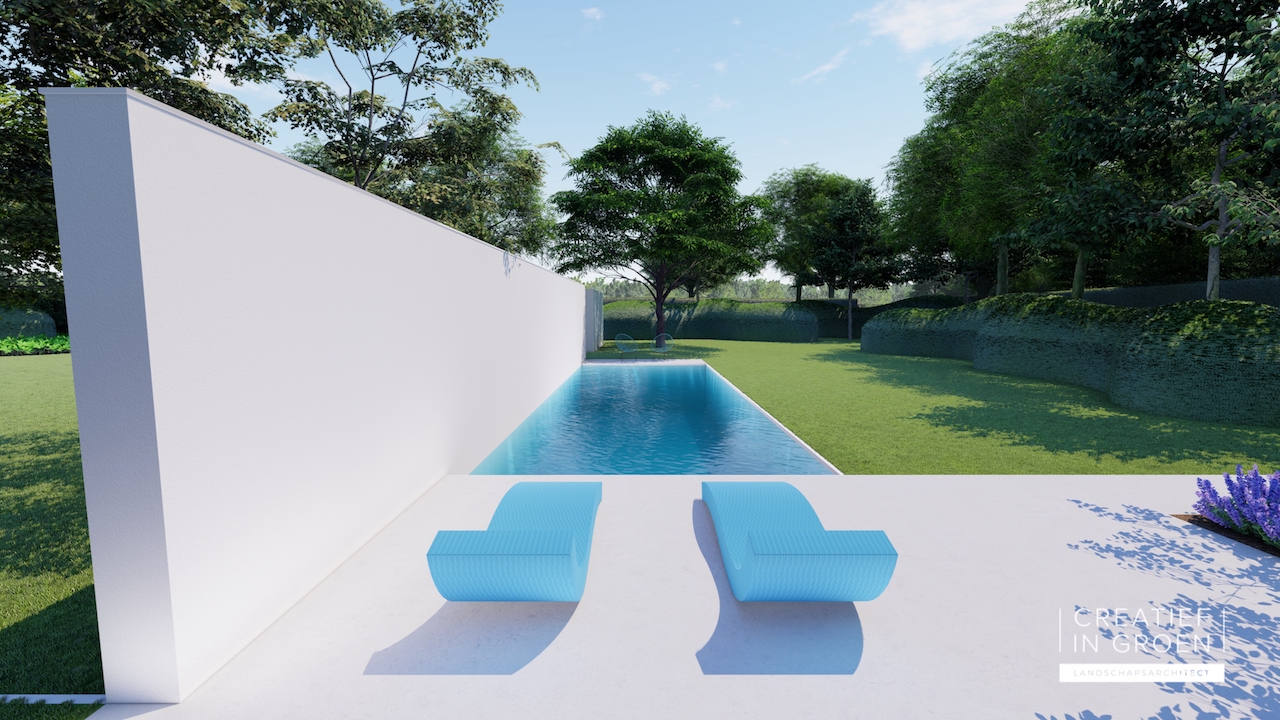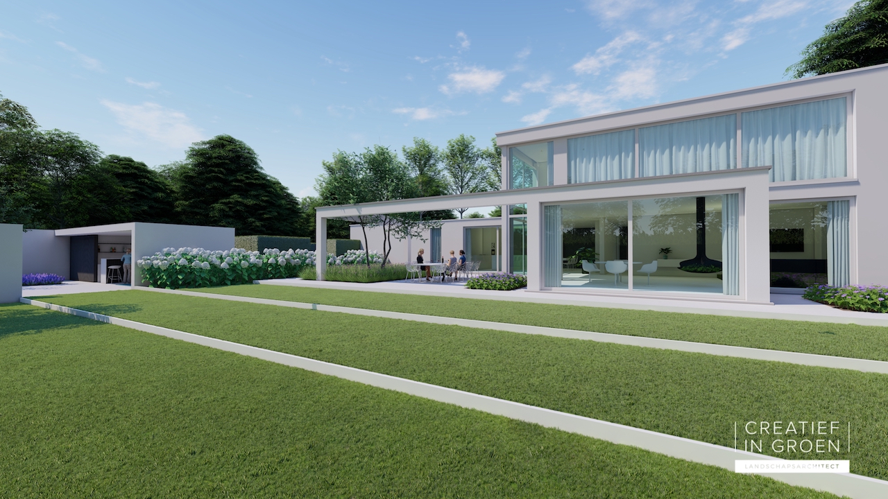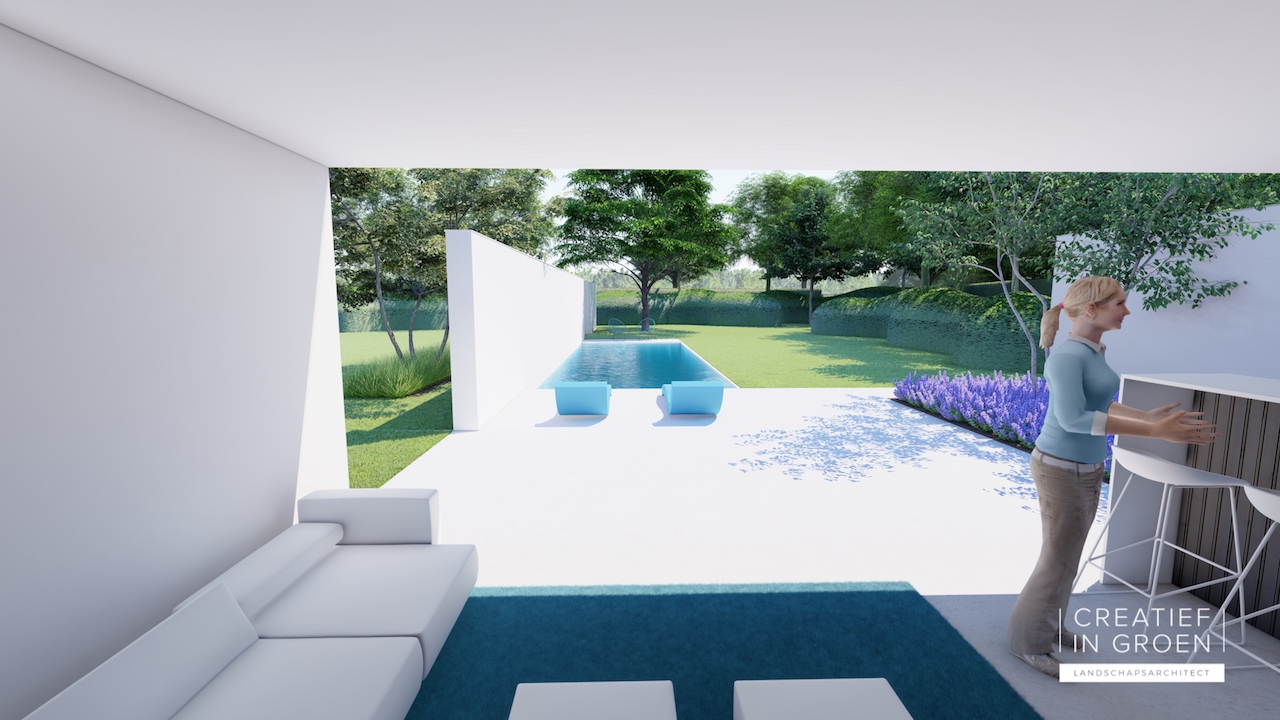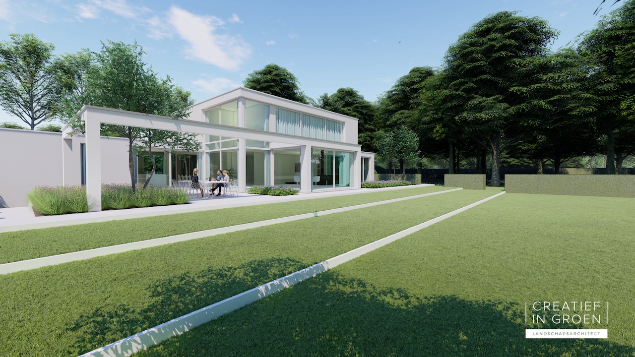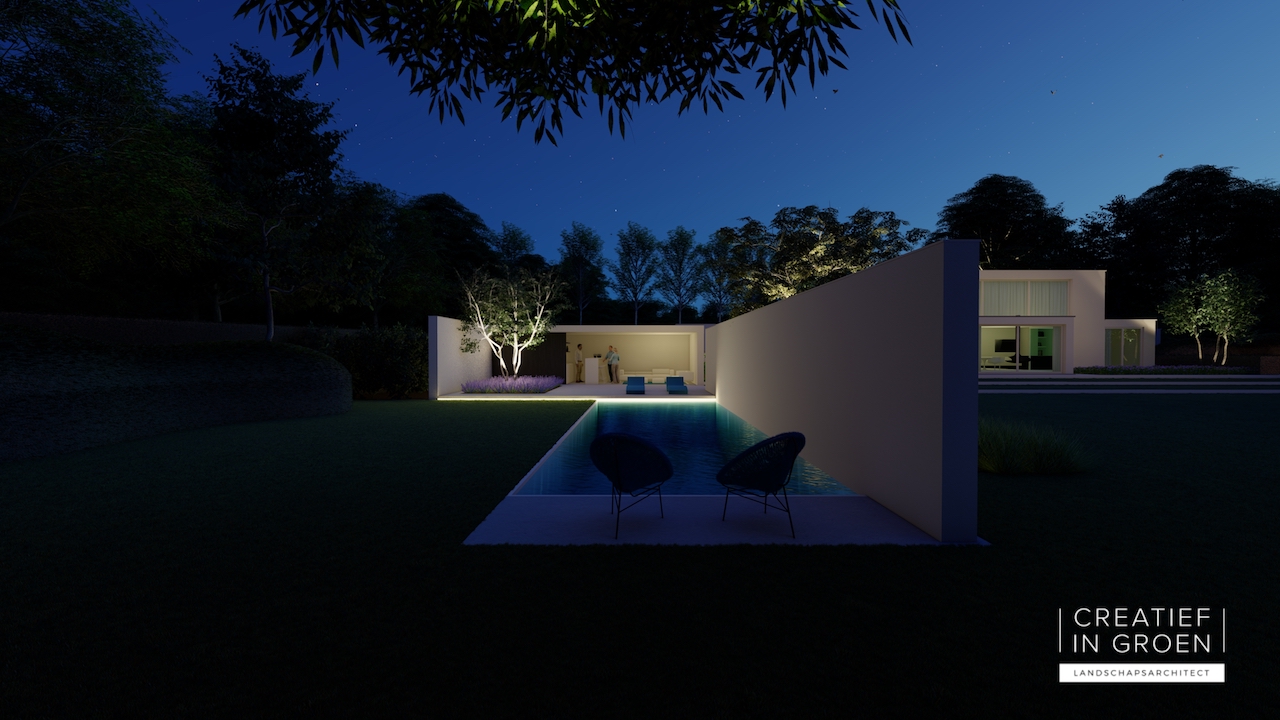 De strakke, eigentijdse uitstraling van de woning vloeit naadloos over in de uitermate groene omgeving van het omliggend landschap. De soberheid in de buitenruimte laat de woning uitermate tot zijn recht komen in een prachtig bosrijk gebied. De inplanting van het minimalistisch zwembad en het bijhorend poolhouse wordt zodanig ingepland dat de rechtsstreekse beleving en contact met het landschap extra geaccentueerd wordt.