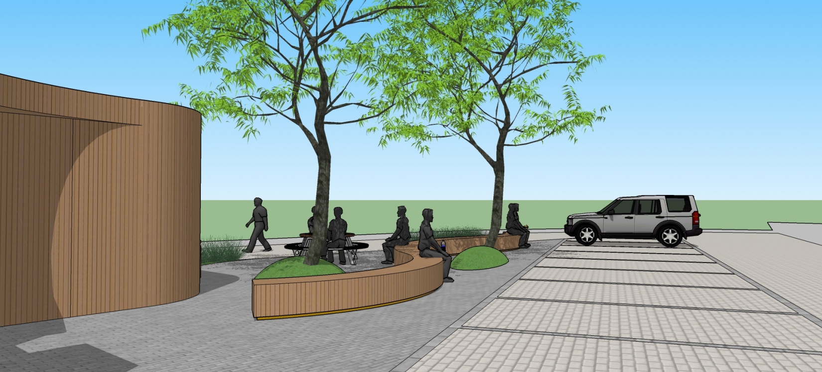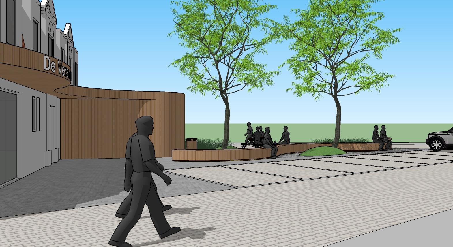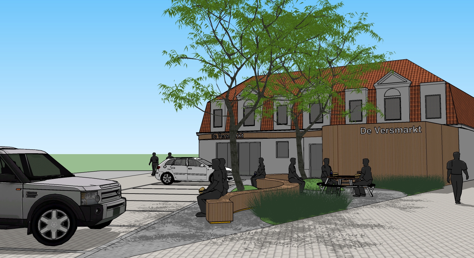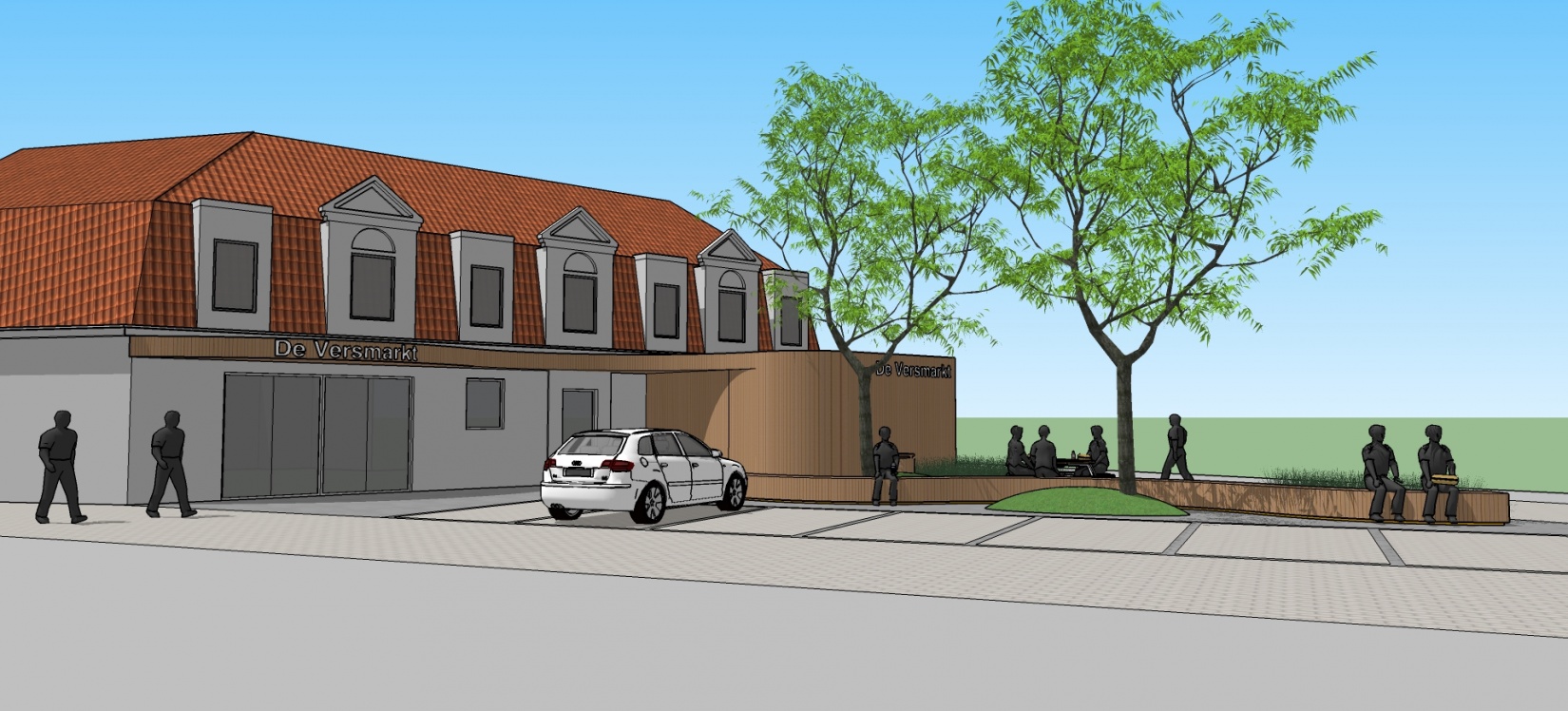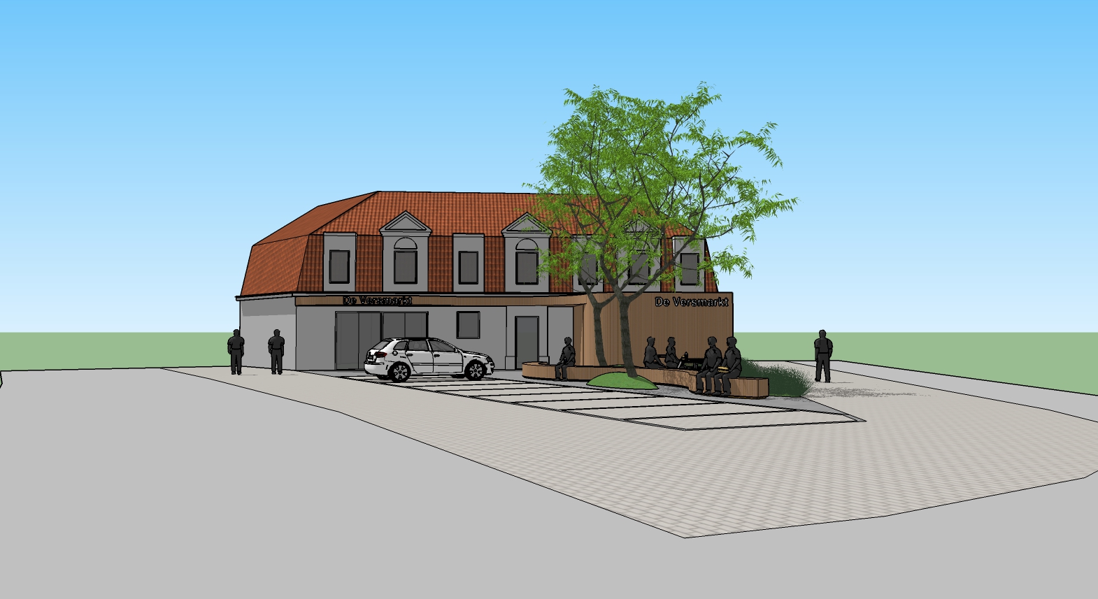De sterk gedifferentieerde, uitgesproken perceelsgrenzen vormen het kader en het aanblik voor de zaak van de bouwheer. Het uitgangspunt is om een (semi-) openbare buitenruimte te creëren waarbij de buurtwinkel onuitgesproken tot zijn recht komt en waarbij deze overvloeit in de voorstedelijke omgeving. Het ontwerp is opgevat als ontmoetingsruimte en buurtpleintje waar studenten en klanten buiten kunnen lunchen. Een lange, speelse zitbank nodigt de bezoeker direct uit om van een aangename rustpauze te kunnen genieten. Bovendien verdoezelt dit organisch zitobject de uitgesproken grenzen. De speelse luifel vormt rechtstreeks het verlengde van het zitobject en mondt uit op de carport met geïntegreerde bergruimte.