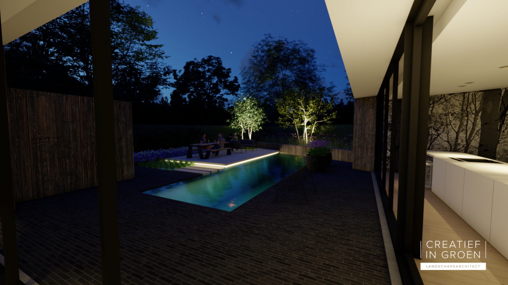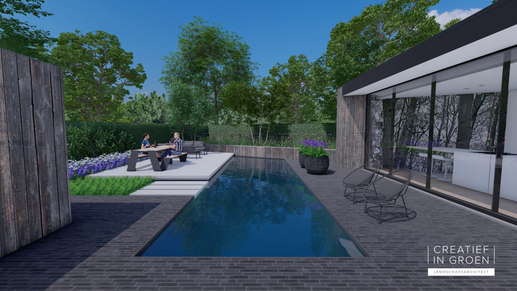 De sfeer van architectuur en interieur wordt doordacht vertaald naar de buitenruimte op een kleinere schaal, waarbij materialisatie de verbindende factor vormt. De stadstuin gaat helemaal op in de groene omgeving. De strakke zwemvijver creëert extra dimensies door middel van reflectie van de achtergrond en afkoeling tijdens mooie dagen. Tuinbeleving gegarandeerd!